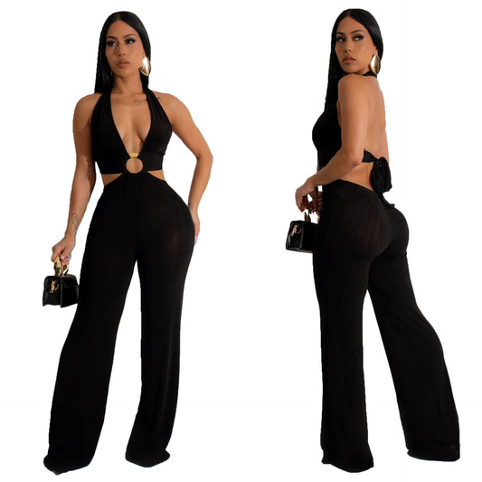 Halter Neck Sleeveless Jumpsuit Solid Color Wide Leg Pants