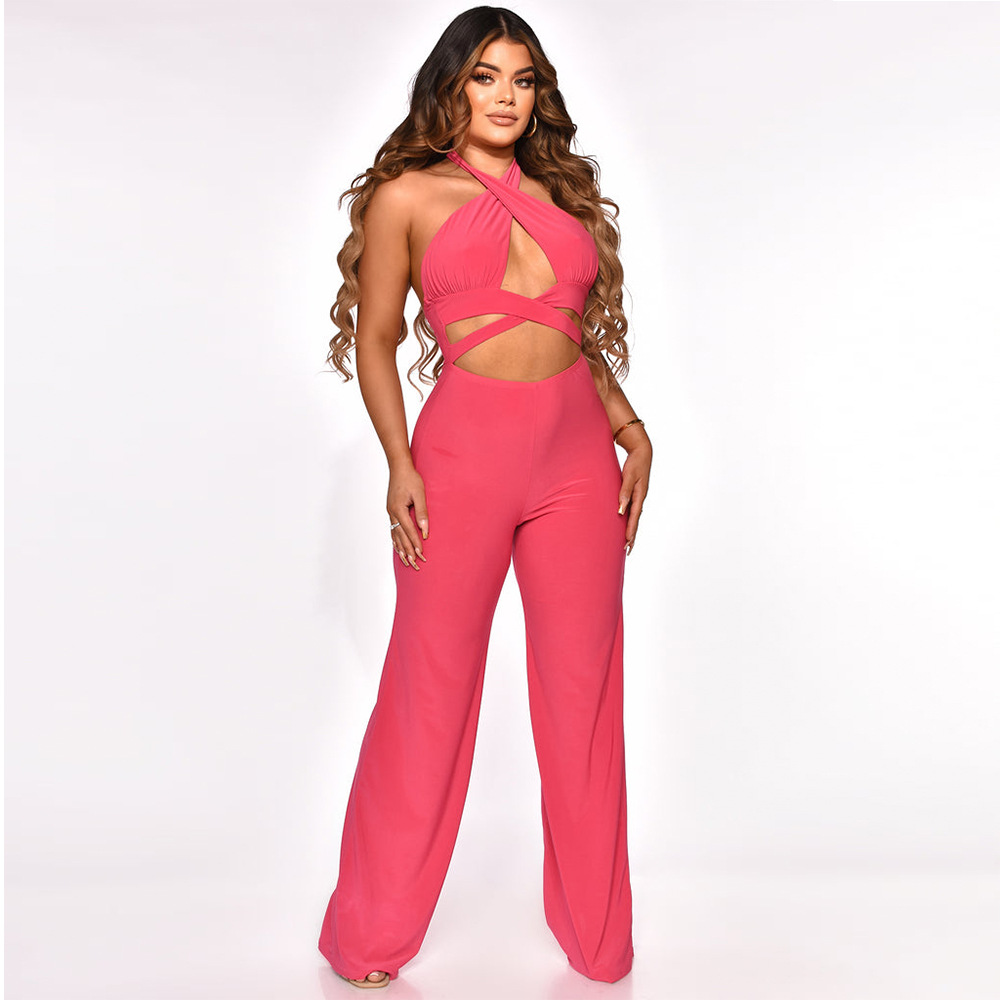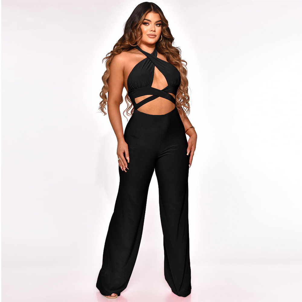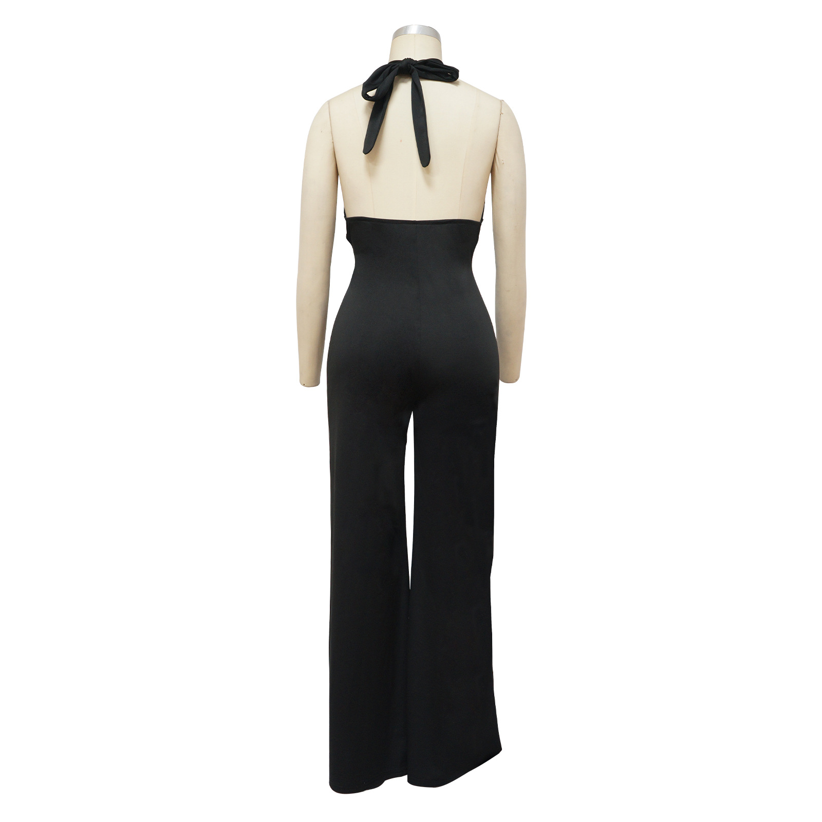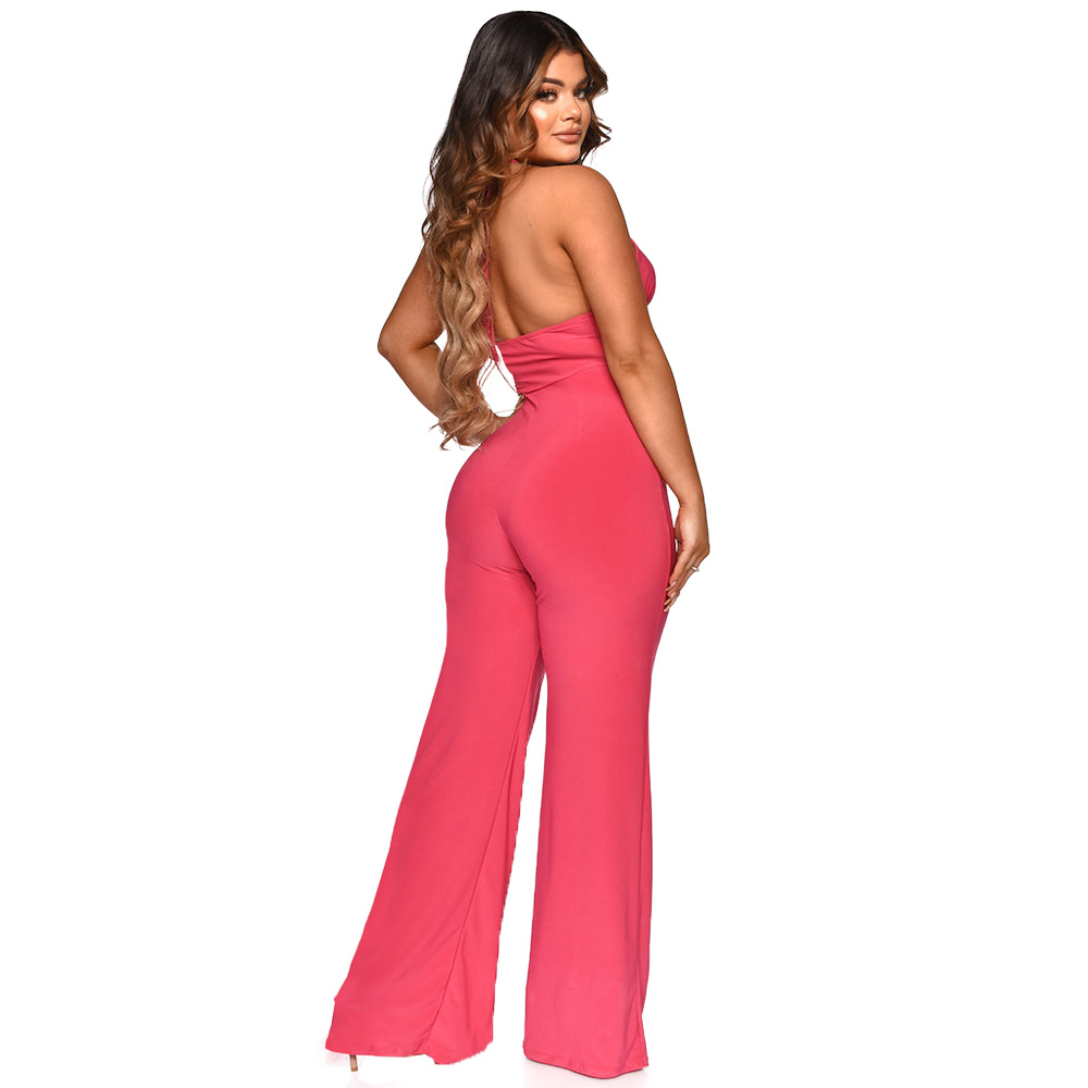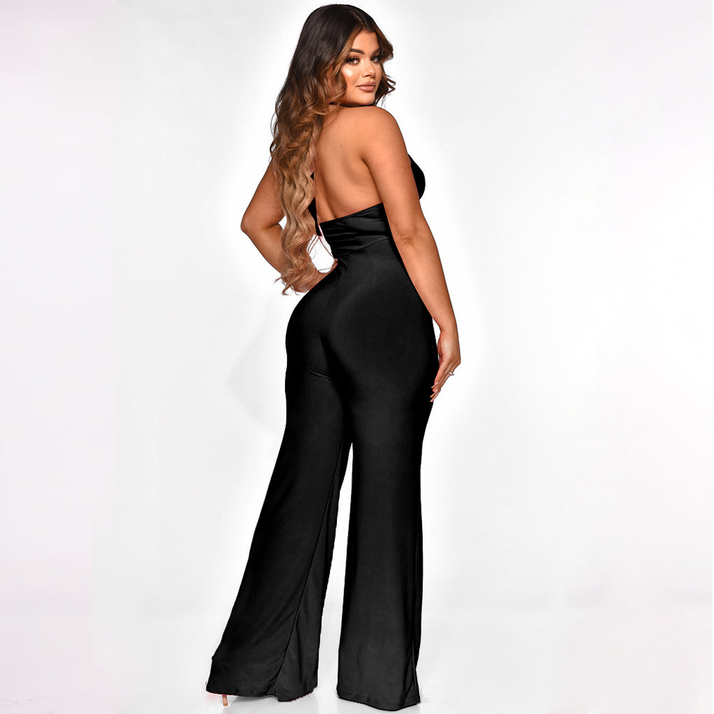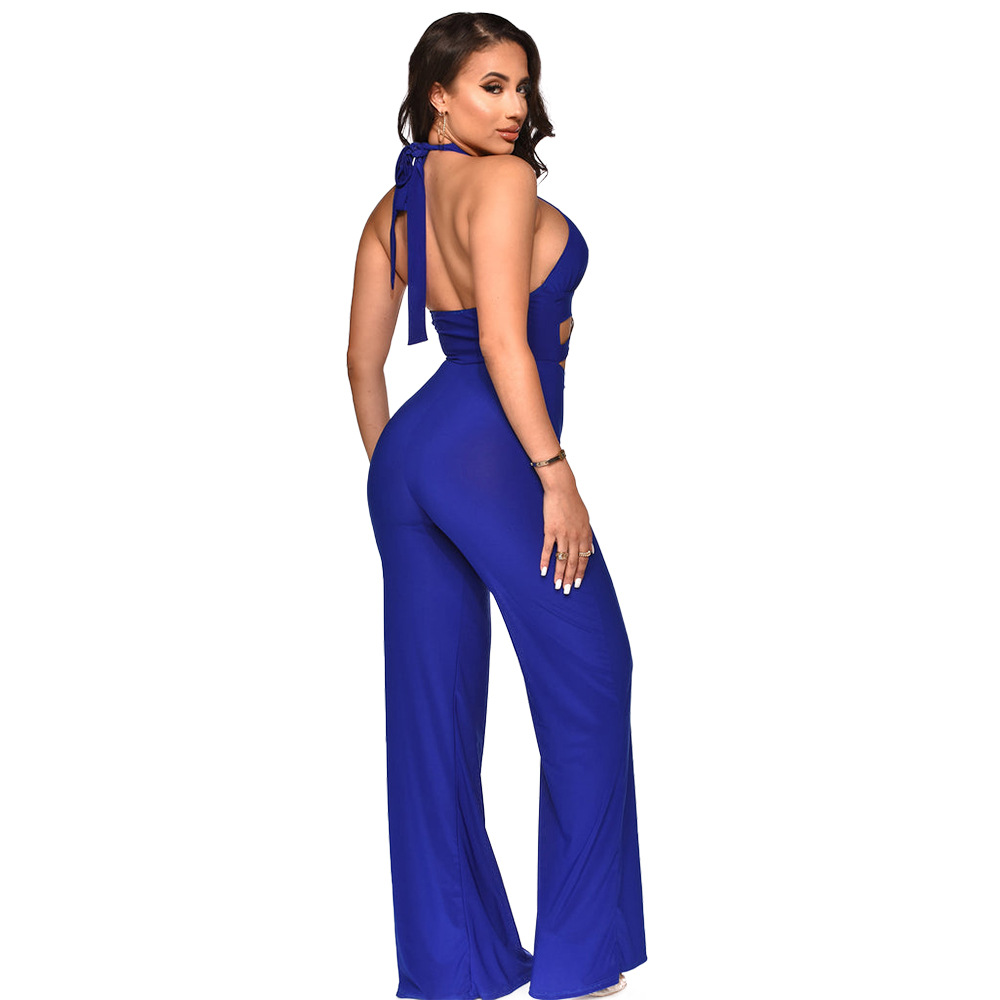 Halter Neck Sleeveless Jumpsuit Solid Color Wide Leg Pants